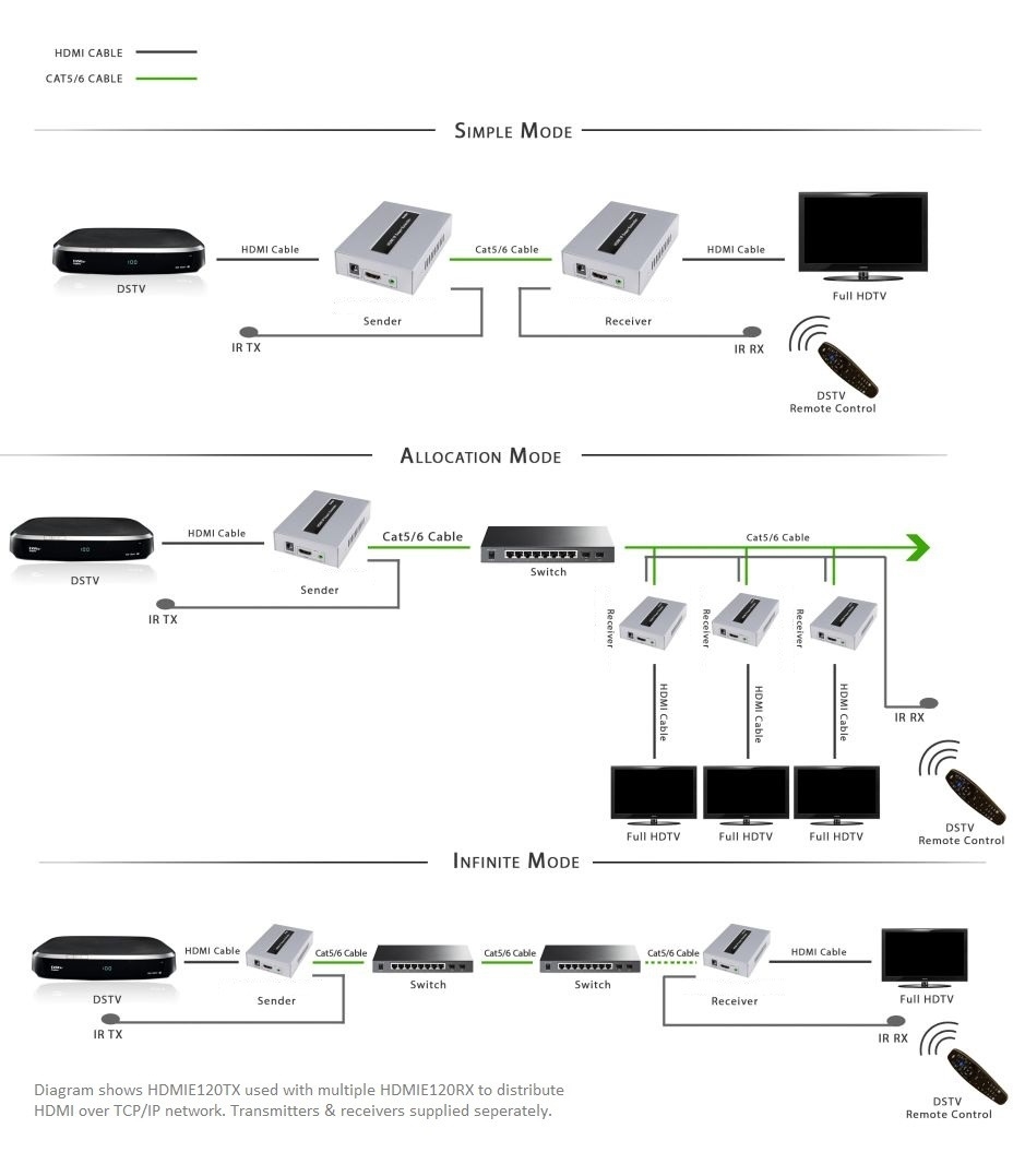 HDMI signals can be distributed to remote viewing stations up to 120m away using a TCP/IP network. This distance can be increased by extending the network with additional switches or using optic fibre between switches or media converters. Shop now.
